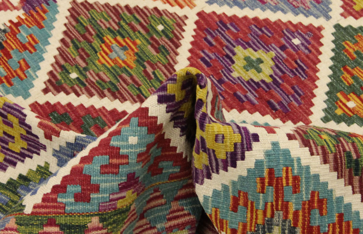 Der Kelim Afghan Old Style ist eines der traditionellen Kunsthandwerke Afghanistans, das im Laufe der Geschichte sehr alt ist und auf der ganzen Welt berühmt und beliebt ist. Kelim Afghan Old Style werden von einer Maschine namens Tabe Bafi hergestellt, die aus Materialien wie Baumwolle oder Wolle zusammengewebt und am Ende gefärbt wird. Für Designer afghanischer Teppiche ist der alte Stil sehr attraktiv. Geometrische, blütenblattförmige, historische und hinduistische Motive gehören zu den ursprünglichen Designs afghanischer Teppiche. Im Laufe der Geschichte Afghanistans galt es als eines der kulturellen und künstlerischen Symbole dieses Landes und wird immer noch in Betracht gezogen und verwendet.