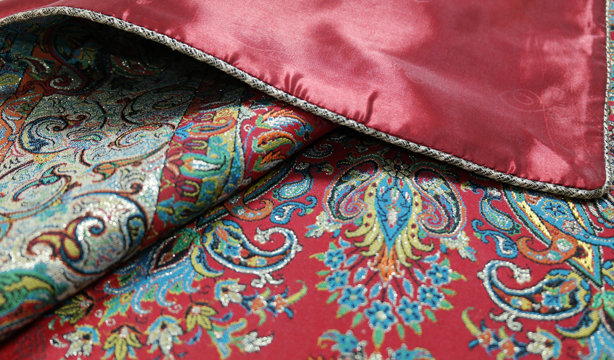 Diese Decke ist keine gewöhnliche Textilie, sondern ein Stück Geschichte. In Persien als „Termeh“ bekannt, basiert diese Webkunst auf jahrhundertealten Traditionen. Anders als bei bedruckten Stoffen werden hier die Muster mit feinsten Fäden gewebt. Die klassischen Paisley-Motive (Boteh) und die architektonischen Ornamente erzählen Geschichten aus 1001 Nacht. Jedes Stück ist das Ergebnis präziser Handwerkskunst.