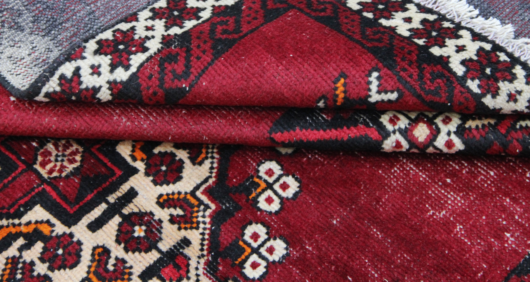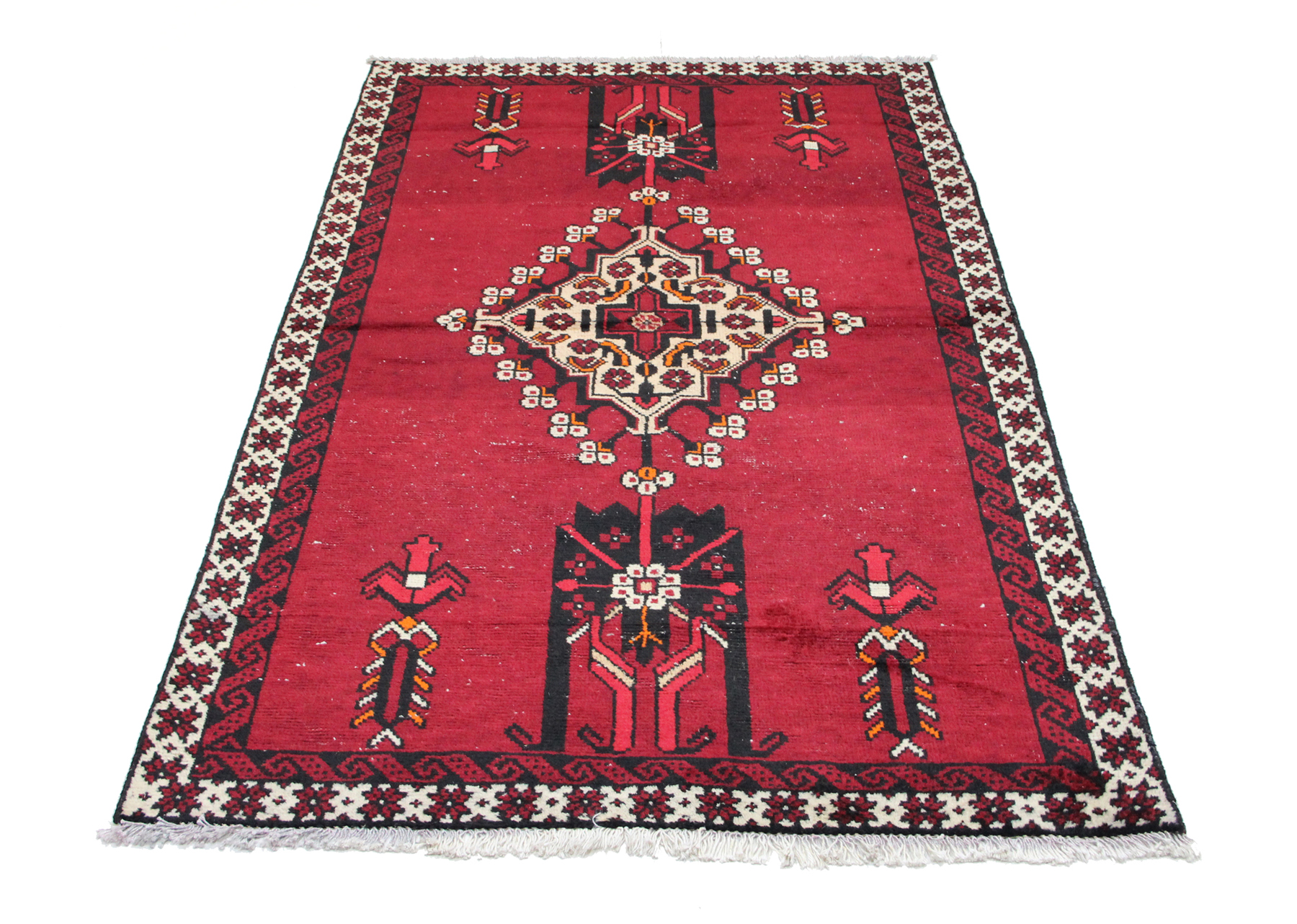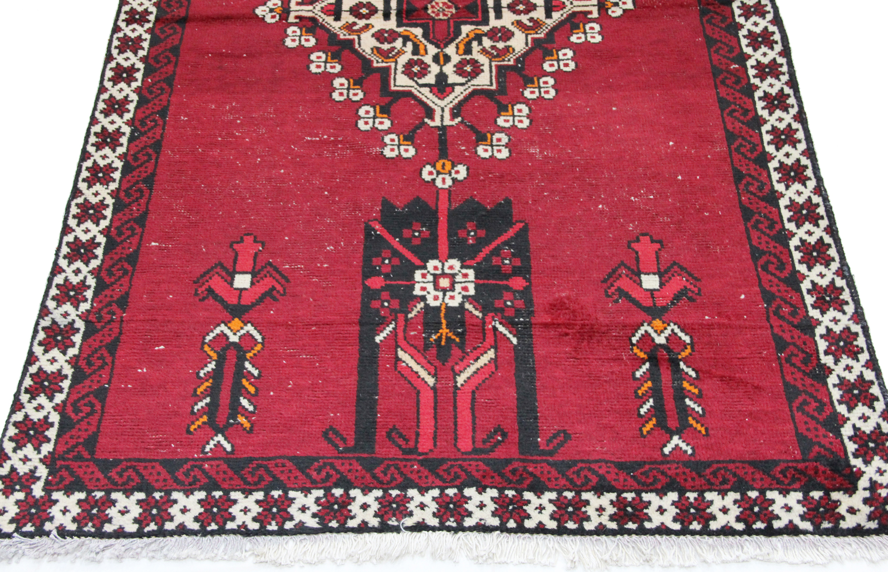 Der Teppich weist altersbedingte Gebrauchsspuren auf, darunter einige dünnere Stellen sowie leichte Abnutzungen, die seinen Vintage-Charakter unterstreichen. Trotz dieser Spuren ist er weiterhin dekorativ und eignet sich perfekt für Liebhaber echter, gelebter Teppiche.
