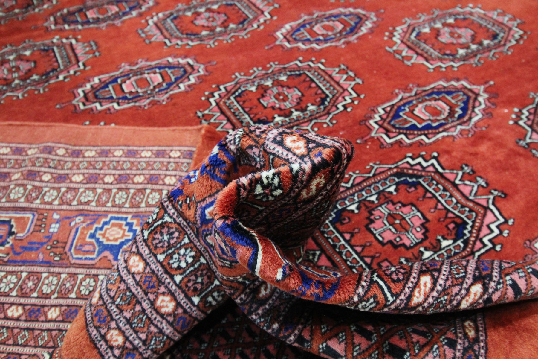 Der Buchara-Teppich ist eines der künstlerischen Meisterwerke Bucharas. Diese Teppiche werden von den geschickten Händen von Buchara-Webern gewebt und in die ganze Welt exportiert. Das Grundmaterial der Buchara-Teppiche ist Wolle und Seide sowie Baumwolle, aus diesem Grund ist bei diesen Teppichen eine besondere Weichheit zu erkennen, die einzigartig ist. Diese Designs sind auch durch künstlerische und geometrische Motive historisch. Die Farben, die Sie in den Buchara-Teppichen sehen, haben alle eine hohe Leuchtkraft und eine sehr hohe Lebensdauer. Buchara-Teppiche werden als Heimdekorationsartikel, Hotels und Luxusorte entworfen. Buchara-Teppiche gelten als eines der wertvollsten Kunsthandwerksprodukte Irans und werden in Kunstausstellungen und internationalen Auktionen stets geschätzt und gewürdigt.
