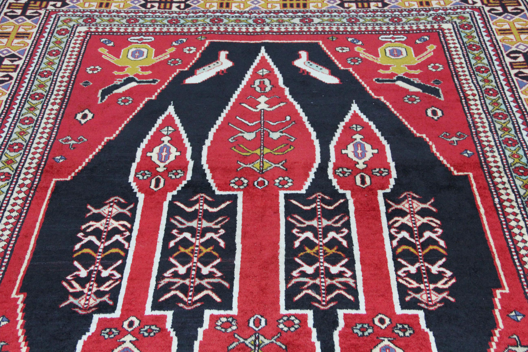 Material: Diese Teppiche bestehen meist aus handgesponnener Wolle auf einer Baumwoll- oder Wollkette, was ihnen eine feine, strapazierfähige Struktur verleiht.