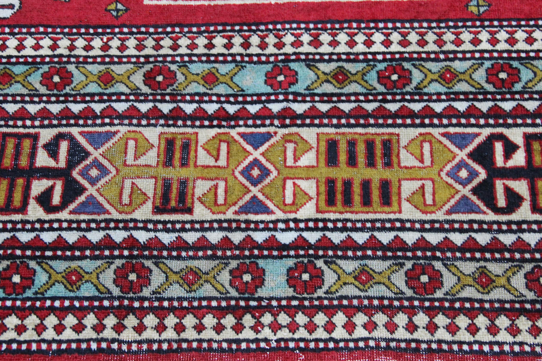Dises hochgeladenes Bild zeigt einen klassischen Shirvan-Teppich mit einem typischen roten Feld, zentralen Medaillons und geometrischen Ornamenten. Die markanten Kantenmuster und feinen Details sprechen für ein handgefertigtes Unikat.