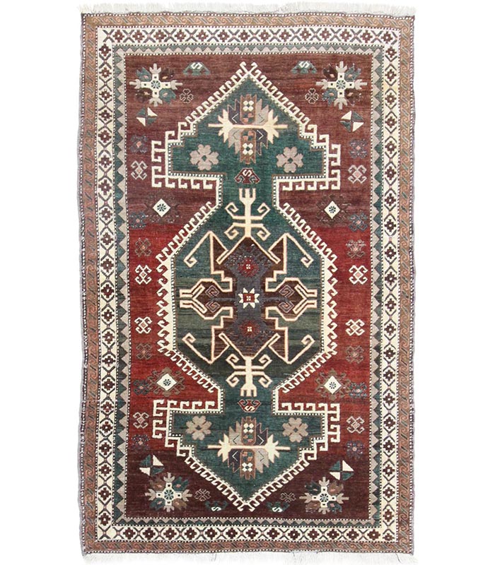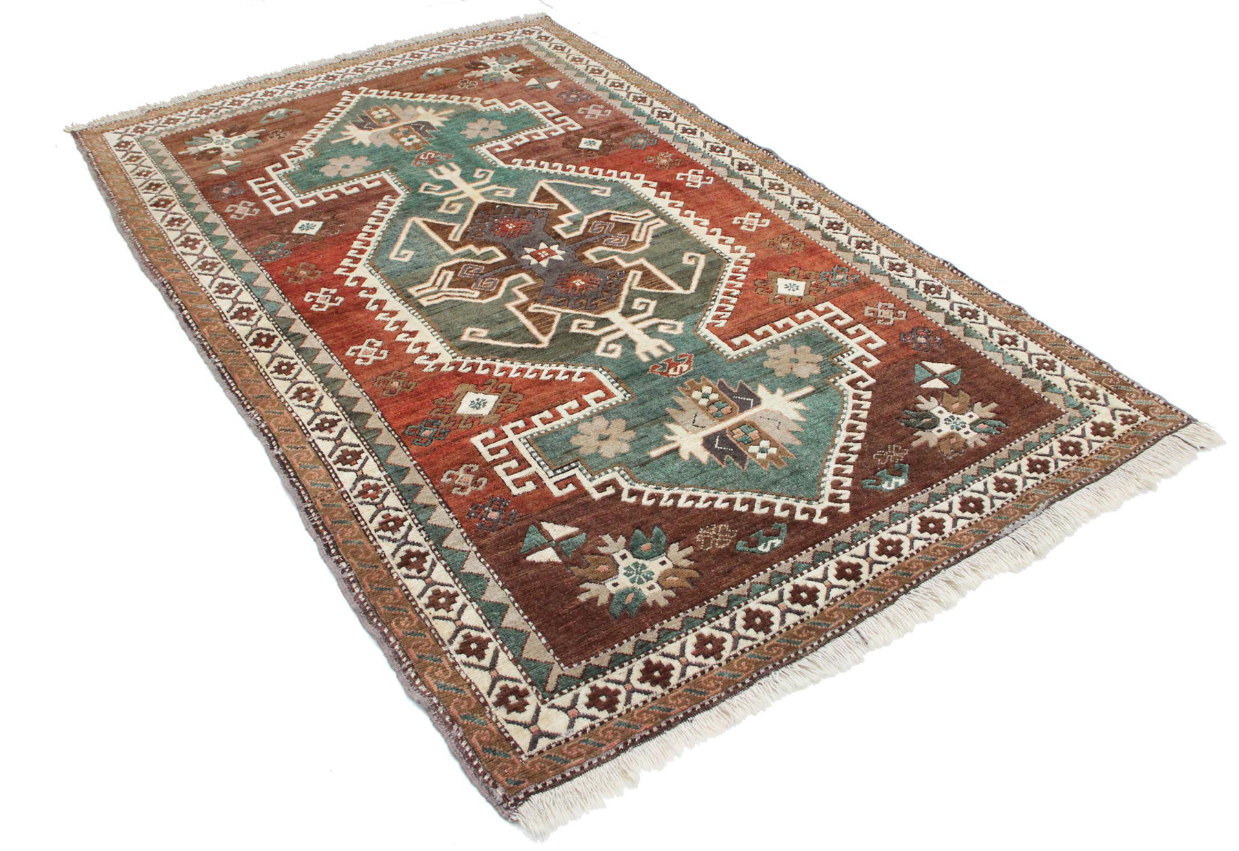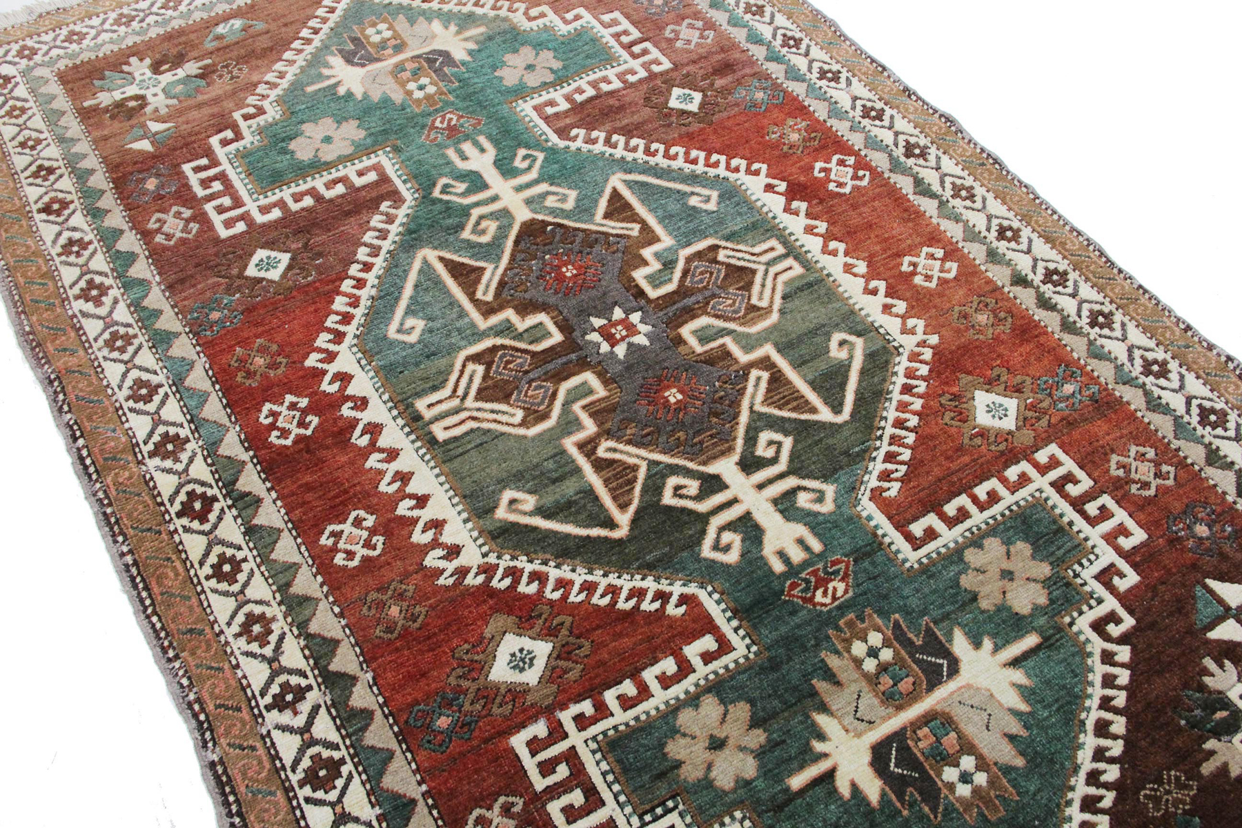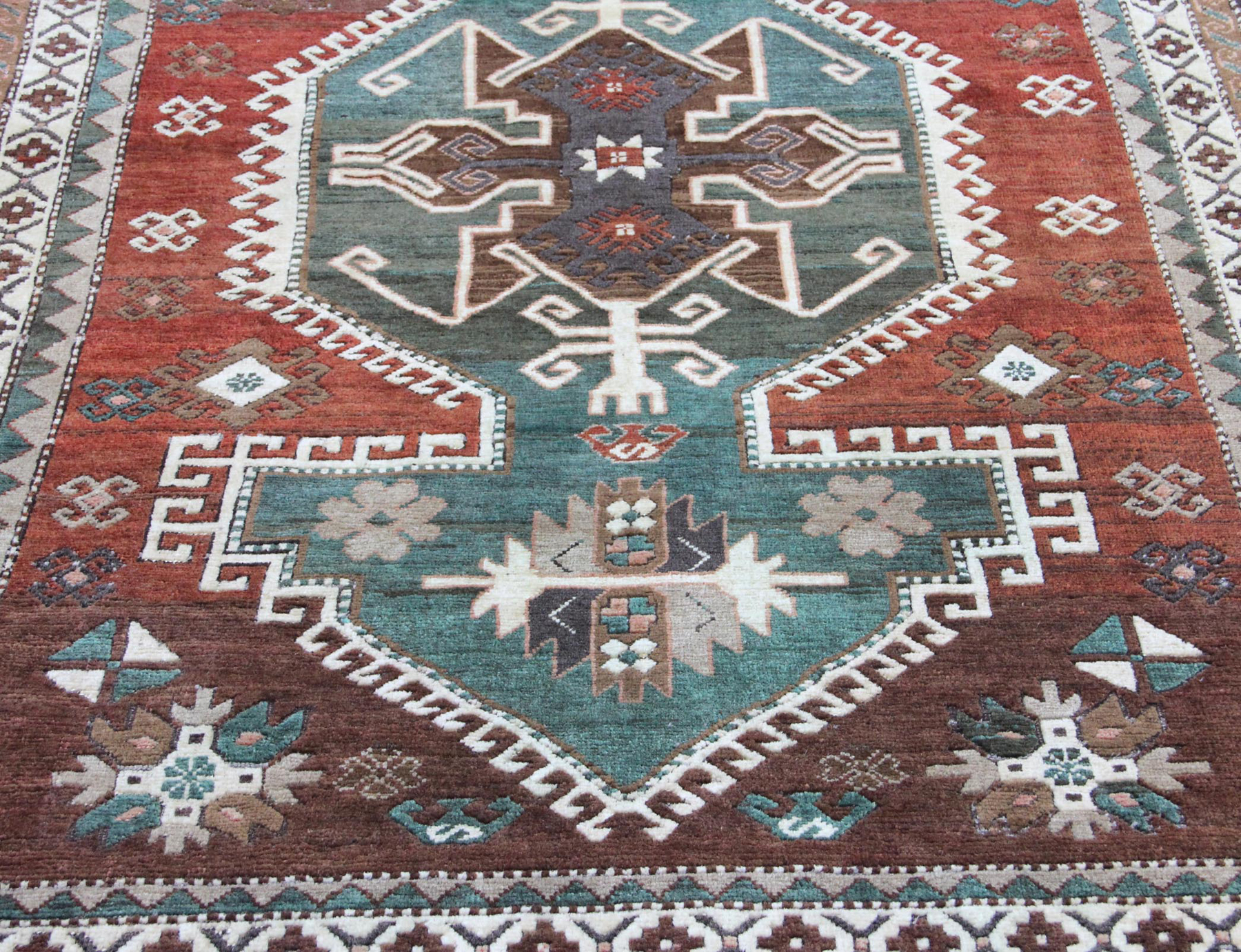 Dises hochgeladenes Bild zeigt einen klassischen Shirvan-Teppich mit einem typischen roten Feld, zentralen Medaillons und geometrischen Ornamenten. Die markanten Kantenmuster und feinen Details sprechen für ein handgefertigtes Unikat.