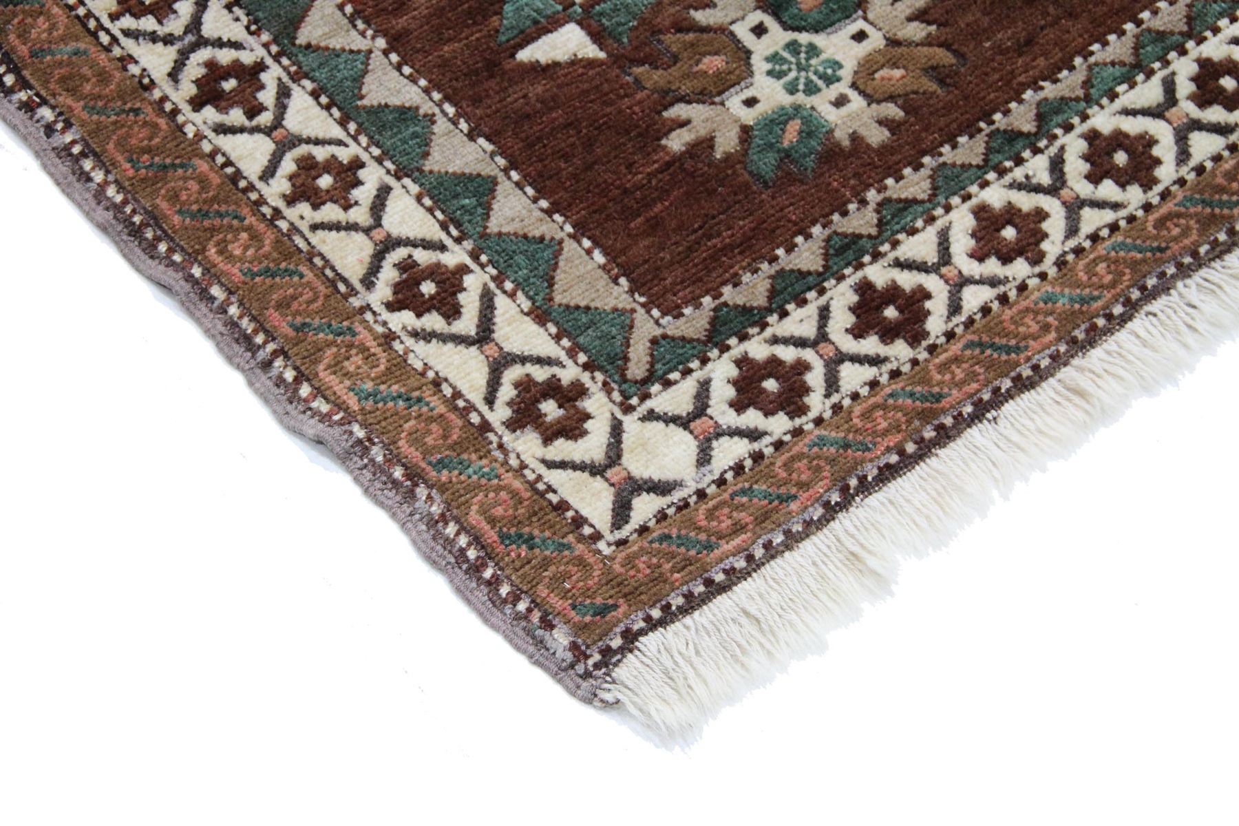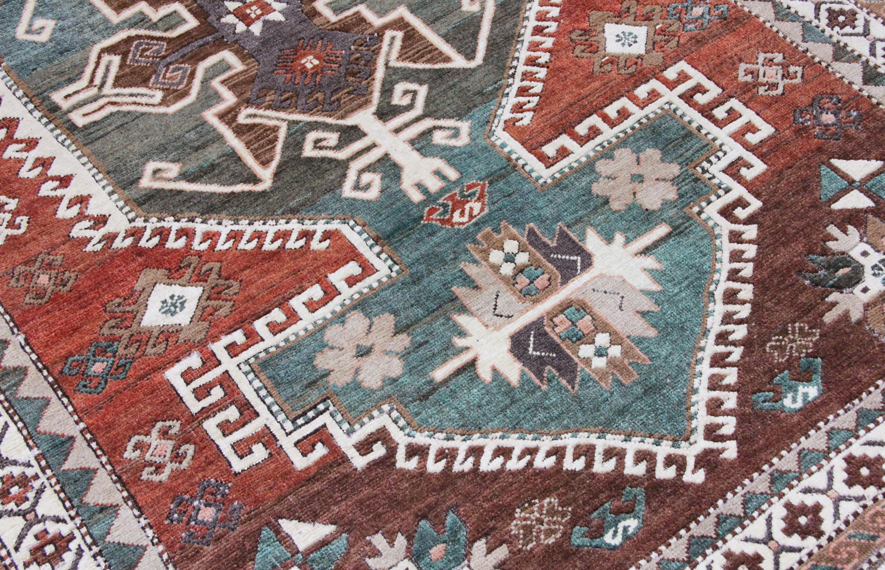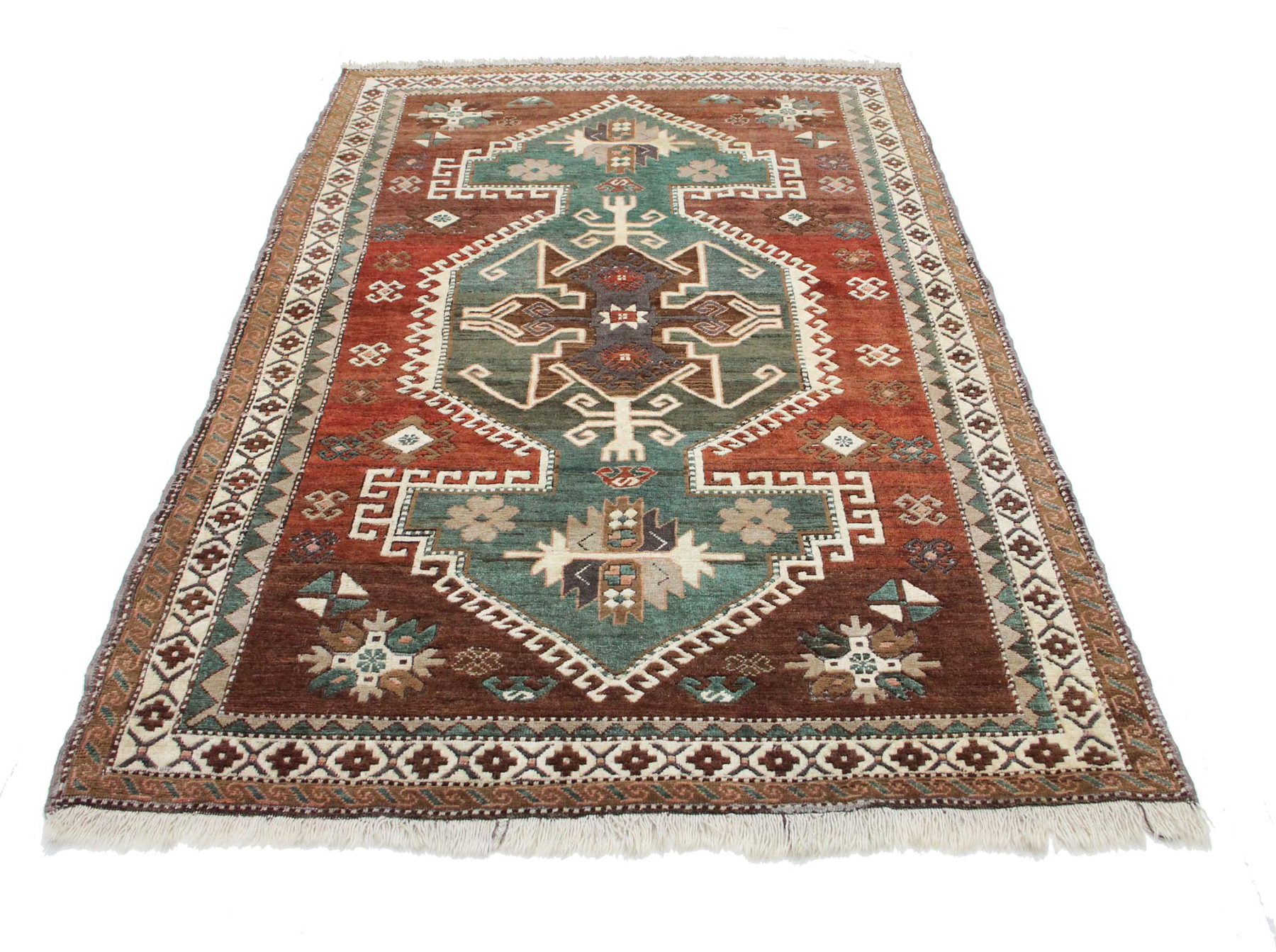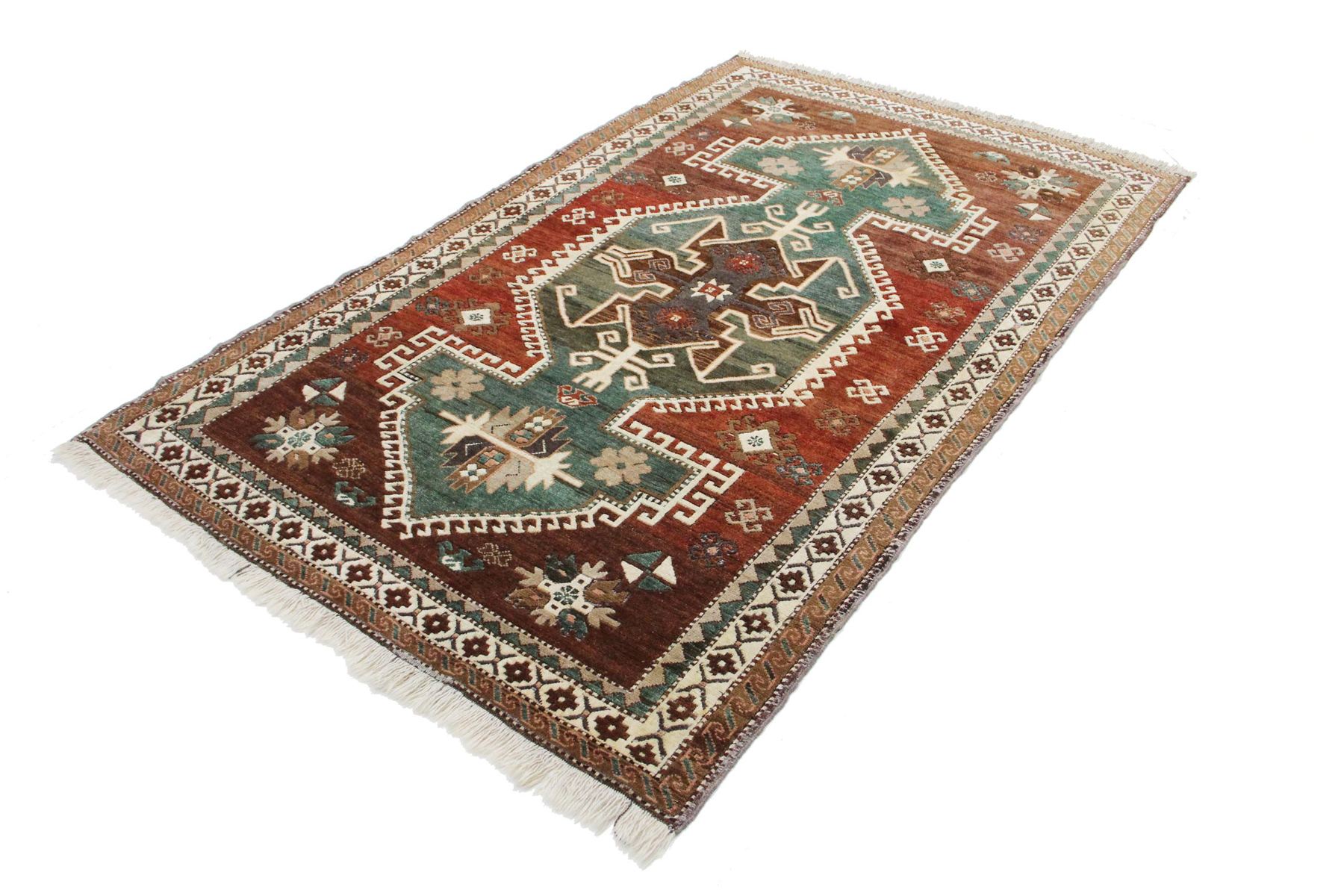 Dises hochgeladenes Bild zeigt einen klassischen Shirvan-Teppich mit einem typischen roten Feld, zentralen Medaillons und geometrischen Ornamenten. Die markanten Kantenmuster und feinen Details sprechen für ein handgefertigtes Unikat.