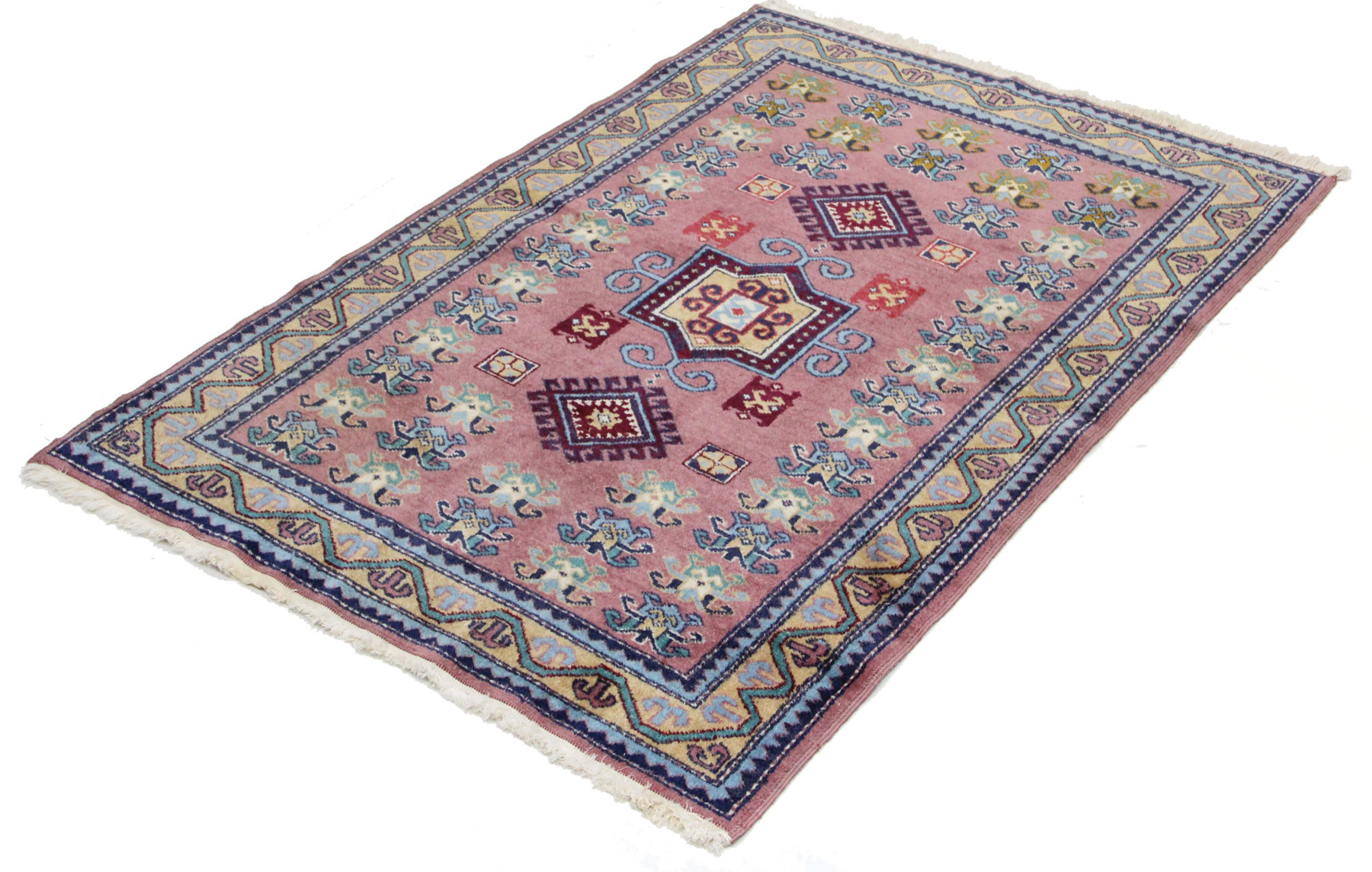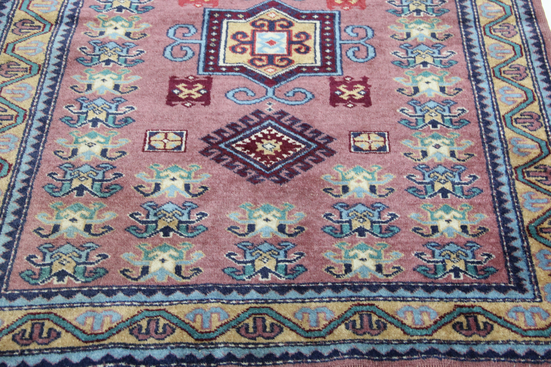 Borte: Die Bordüren sind meist reich verziert mit kaukasischen Symbolen, darunter Hakenmotive (Schutzsymbole), Wellenlinien (Wasserzeichen) und Rosetten.