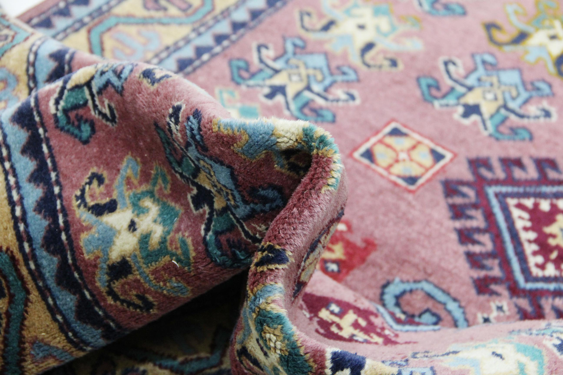 Material: Diese Teppiche bestehen meist aus handgesponnener Wolle auf einer Baumwoll- oder Wollkette, was ihnen eine feine, strapazierfähige Struktur verleiht.