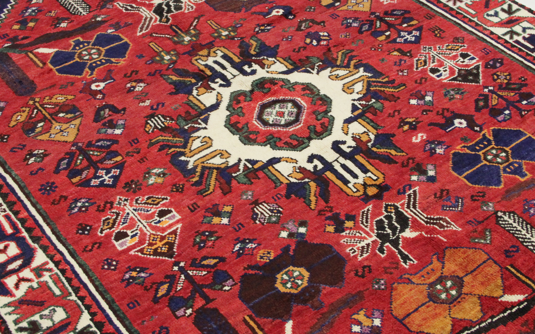 Charakteristisch für Ghashghai-Shiraz-Teppiche sind ihre lebendigen Farben, oft dominiert von Rottönen, Blau- und Grüntönen. Die Muster sind oft geometrisch und selbs gedachte spiegeln die natürliche Umgebung sowie Symbole und Motive oder Tiere wider, die tief in der Nomadenkultur verwurzelt sind. Die Handwerkerinnen weben diese Teppiche oft mit viel Liebe zum Detail, was zu einzigartigen und authentischen Kunstwerken führt.